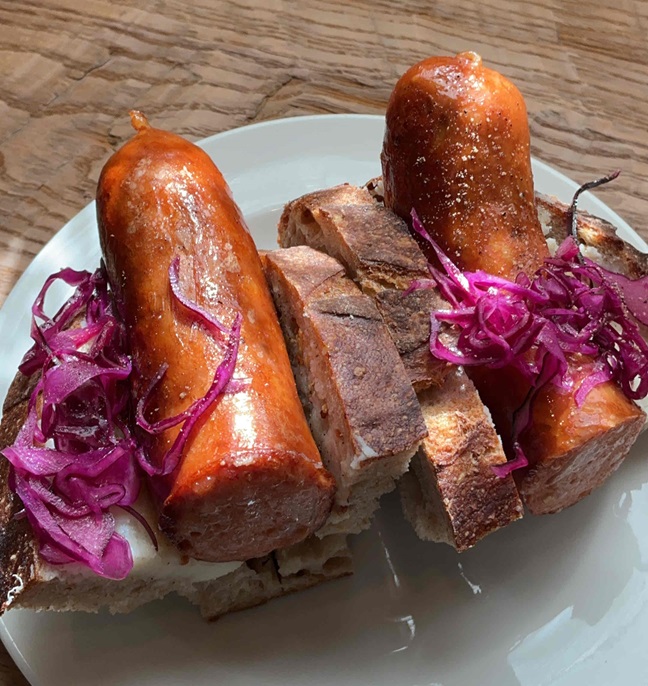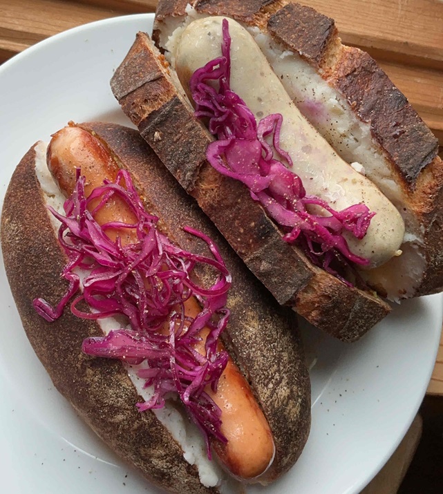マイスター手づくりのドイツソーセージと粒マスタード、自家製マッシュポテト、赤キャベツのマリネを挟んで。ソーセージは下記2種類よりお選びください。