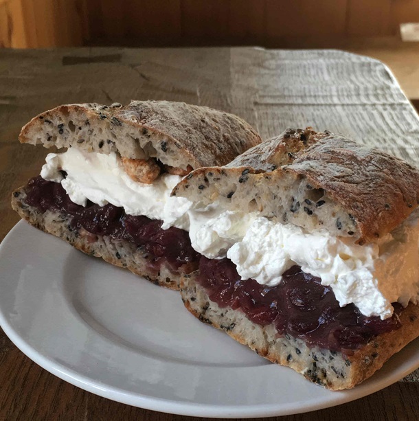 地元藤岡産のやよいひめをジャムにしてクリームチーズをあわせ、バゲットに挟みます。苺のレアチーズケーキをイメージして。