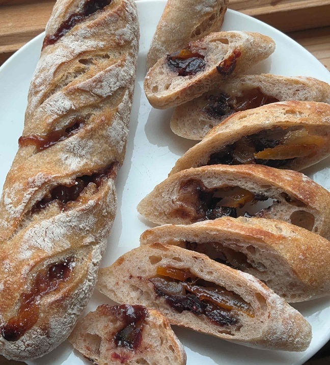 カンパーニュ生地に、チョコチップ、無農薬の自家製夏みかんで作るマーマレード、赤ワイン漬けしたクランベリー、ふじ林檎でつくるりんご煮を包んで焼き上げました。