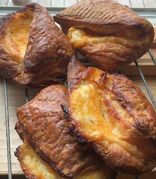 自家製酵母と全粒粉で作る生地によつばバターを手おりで折り込んで、中には瀬戸内レモンと卵、バターでつくるレモンカードと北海道クリームチーズを挟んで。甘酸っぱさがたまりません
