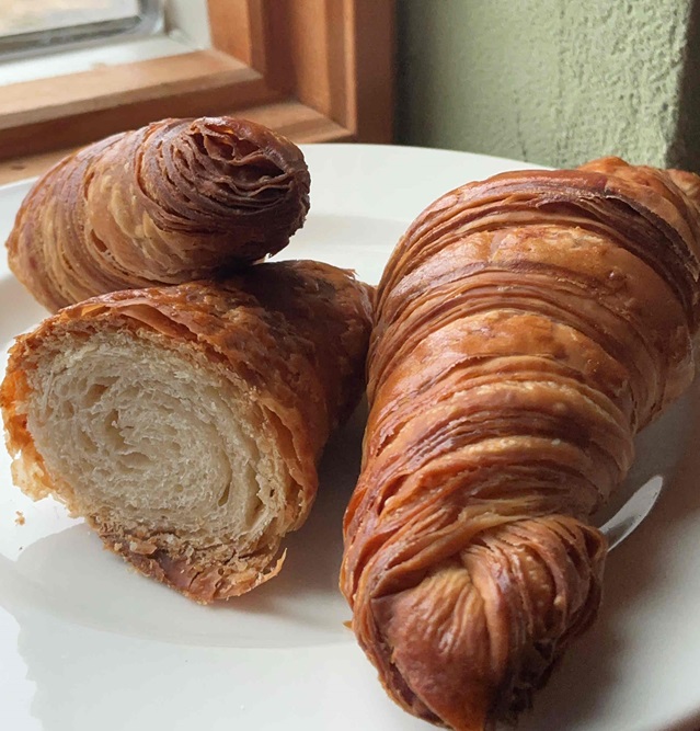 自家製酵母と全粒粉で作る生地によつばバターを手おりで折り込んでつくるざくざくクロワッサンです。
