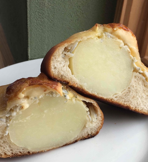 カンパーニュの上に自家製ベシャメルソース、蒸した新じゃがと博多かねふくめんたいこ、チーズをのせて焼きました。