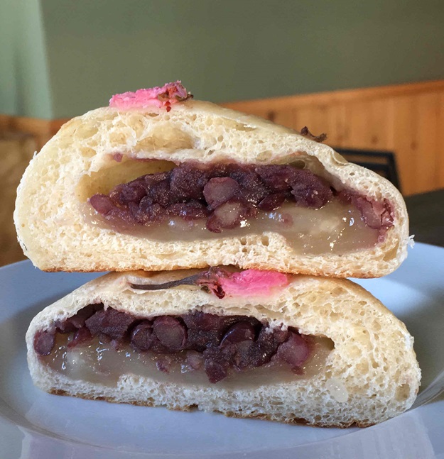柔らかめの全粒粉配合パンに、自家製十勝あんこと自家製ぎゅうひを包んで、仕上げに桜の塩漬けを。春の限定あんぱんです。